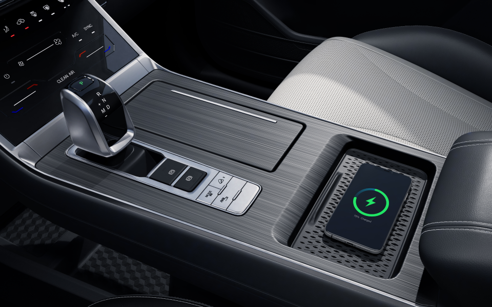 A sleek central console with touch controls, electronic gear selector, and wireless charging, offering a modern and high-tech feel.